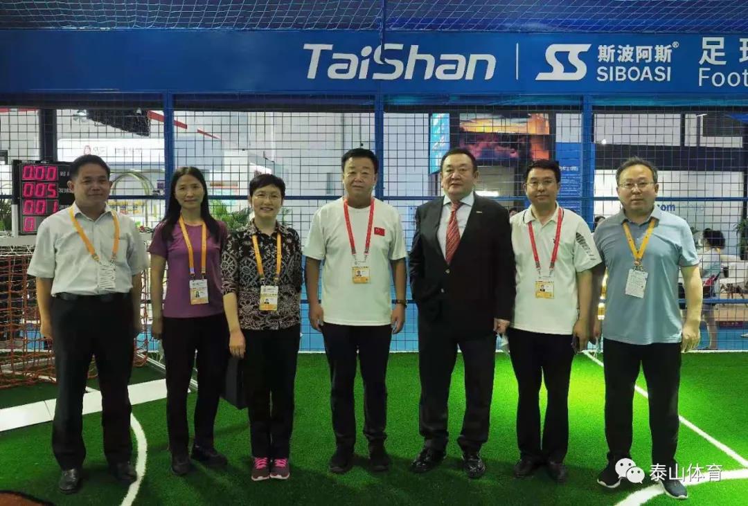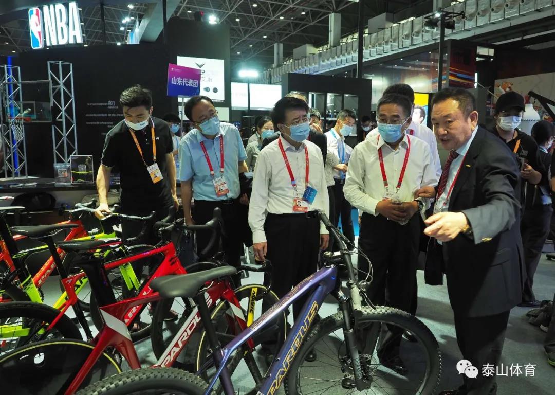 山东省商务厅厅长张德平在球王会体育产业集团董事长卞志良陪同下参观一号馆球王会体育展厅。