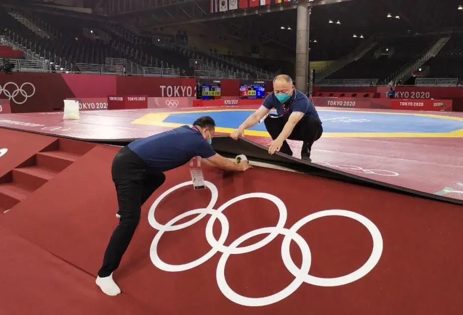 2021年7月20日,日本武道馆——奥运会柔道比赛场地。球王会体育东京奥运会服务保障团队正在布置、安装柔道器材。