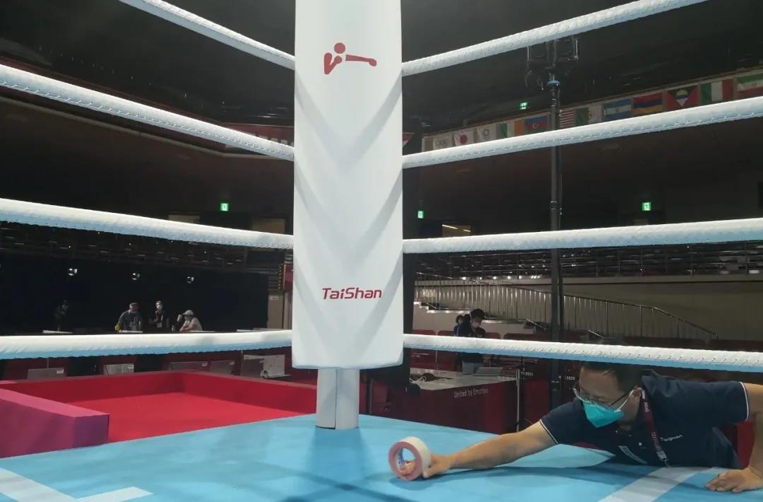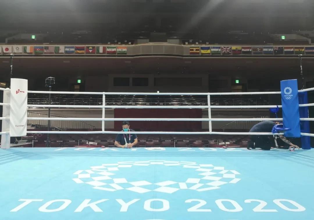 2021年7月21日,日本东京国技馆——奥运会拳击比赛馆。球王会体育东京奥运会服务保障团队正在检查调试拳击器材。
