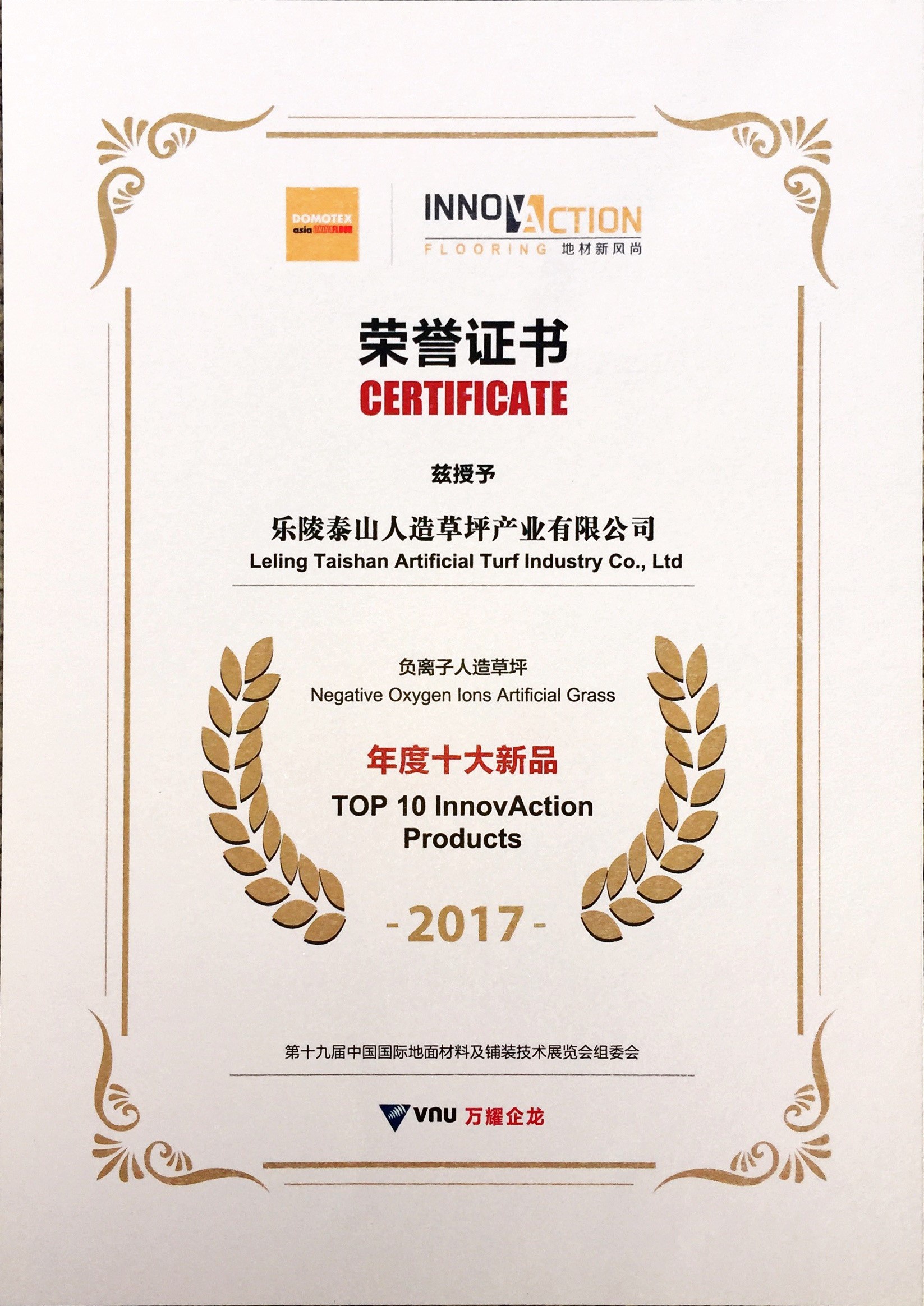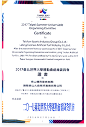 2017台北世界大学运动会组织委员会证书致乐陵球王会人造草坪产业有限公司